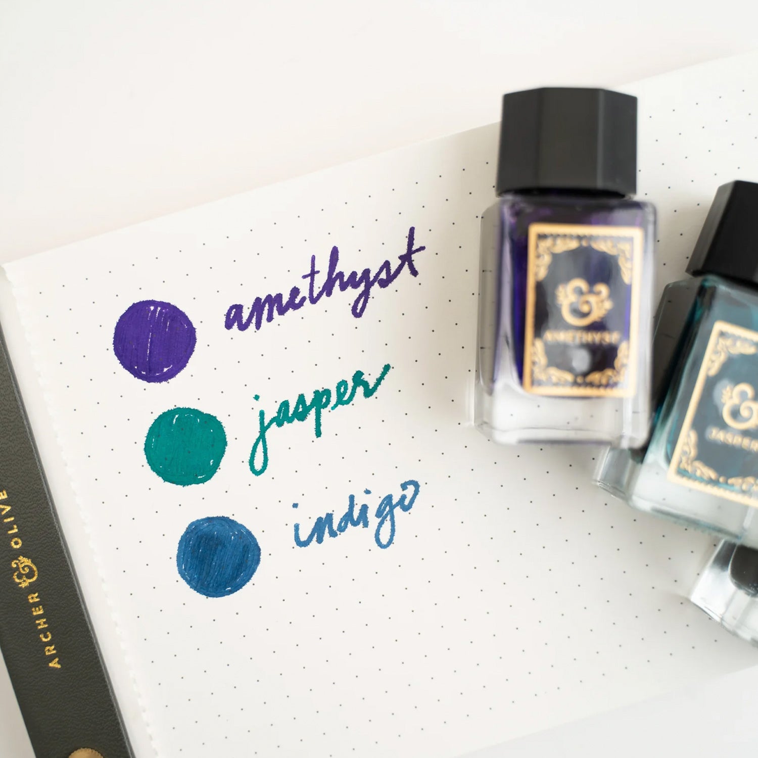 Set de Tintas para pluma fuente. Colores: Indigo, Jasper & Amethyst marca Archer & Olive.