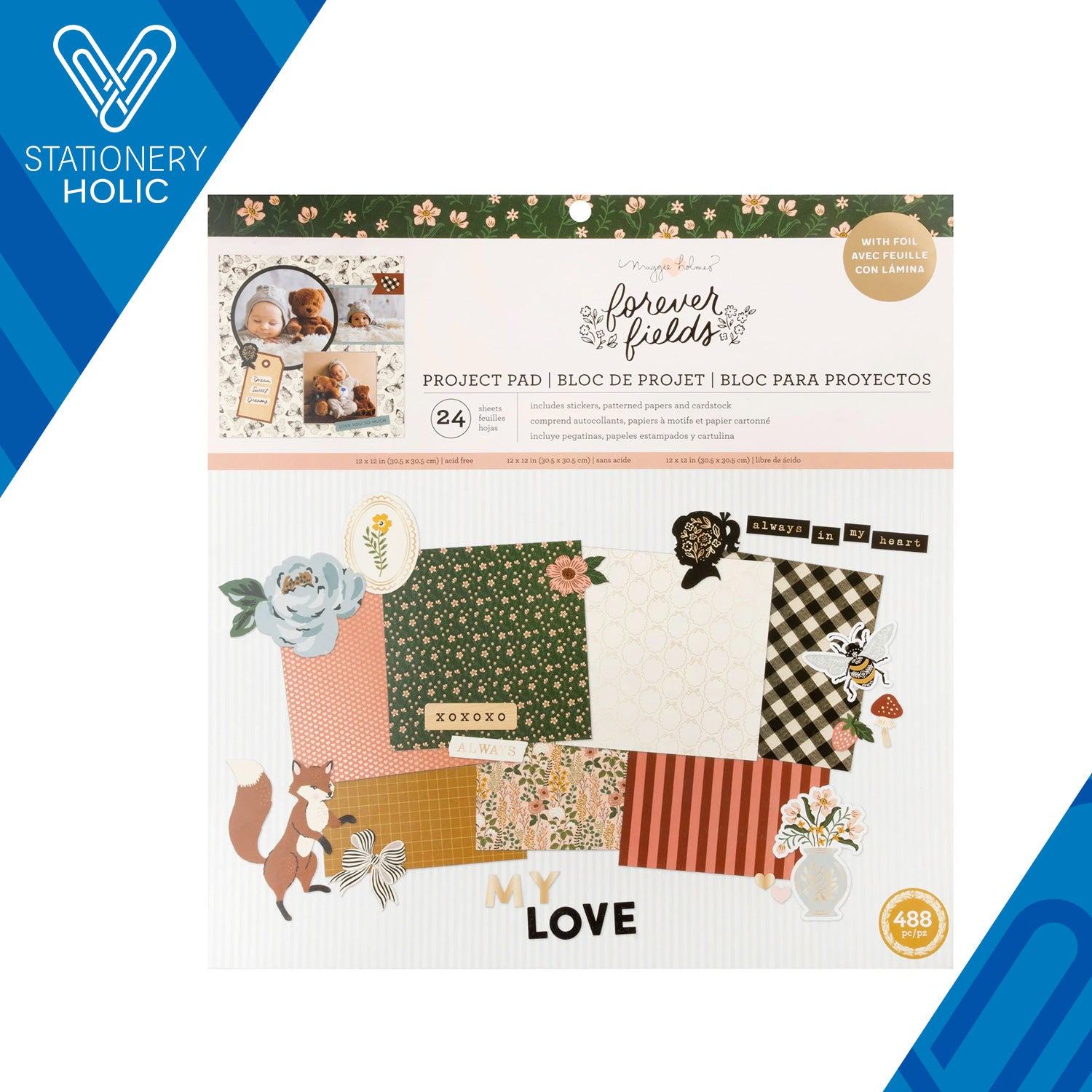 Viene con Hojas de stickers, papel decorado con detalles en foil, papel decorado normal y hojas de color solido de cartulina. Para usar en cualquiera de tus proyectos de scrapbook, collage, journaling, etc.